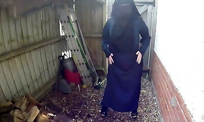 Niqab Bitch! Fette Moslemnutte strippt im Hinterhof!